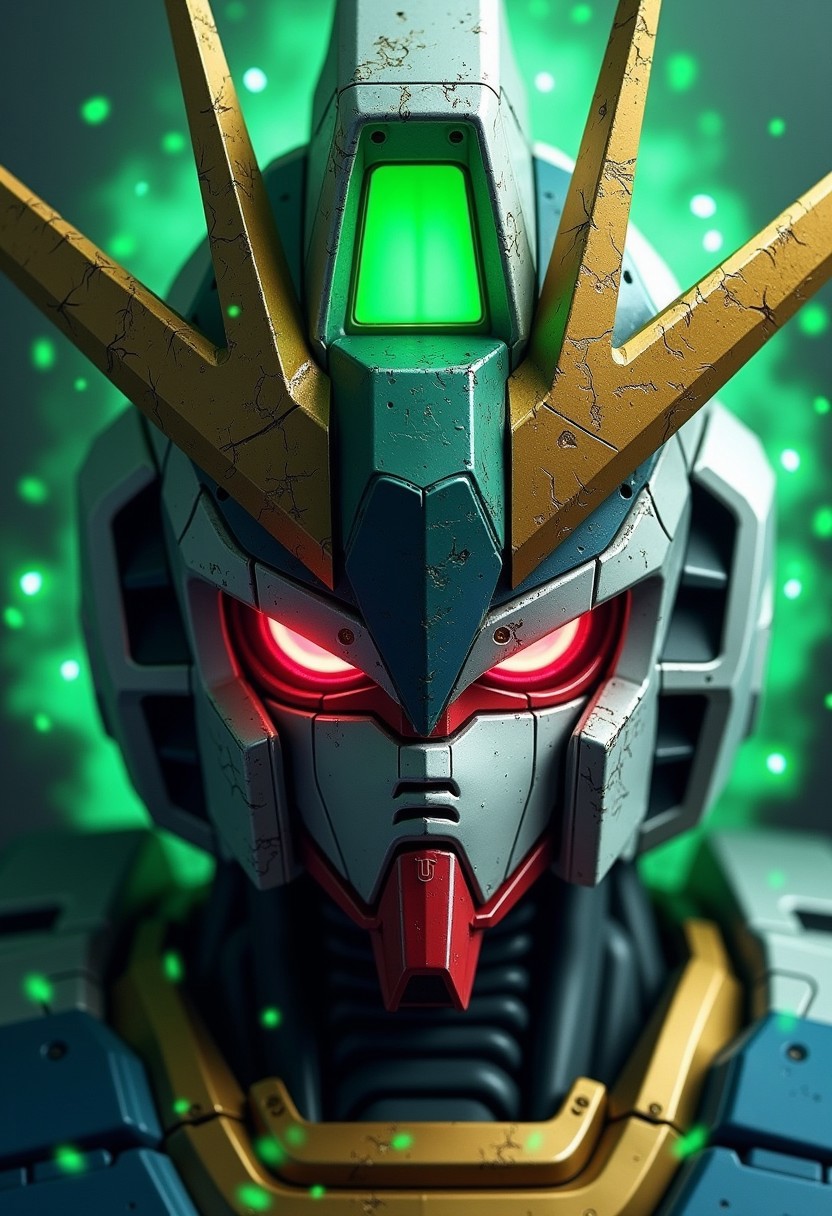 The image depicts a close-up of a mecha robot, likely the gundam_exia from the Gundam series. The design is intricate, with sharp lines and various metallic elements, including multiple antennae or "V-fins" that protrude from the head. One half of the robots face is damaged. The robot's eyes are Heterochromia one eye glowing a vibrant green, and one eye is glowing a violent red, and there's a prominent green jewel or energy core at the center of its forehead. Surrounding the head is a field of glowing green particles or sparkles, adding a dynamic and mystical effect to the image. The overall color scheme includes shades of gray for the metal, with green and blue highlights, giving it a futuristic and powerful appearance.