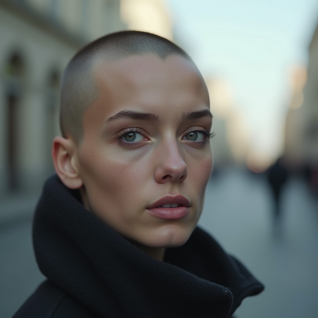 Buzzcut, no hair, bald, natural lighting, Highest Quality closeup Portrait photo of a woman wearing no makeup with a ((buzzcut)), silver eyes, Nikon Z9, realistic matte skin, blurry city in the background, 8K,
