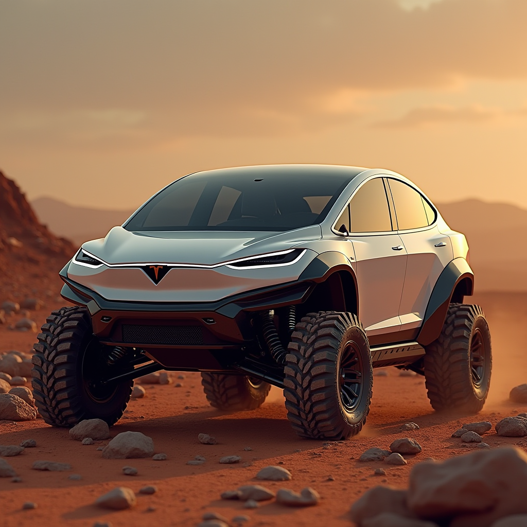 tesla bot driving cybertruck with window down and dong the fingers, driving on mars, rubble, dystopian