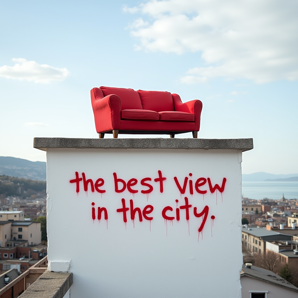 A red sofa on top of a white building. Graffiti with the text "the best view in the city"