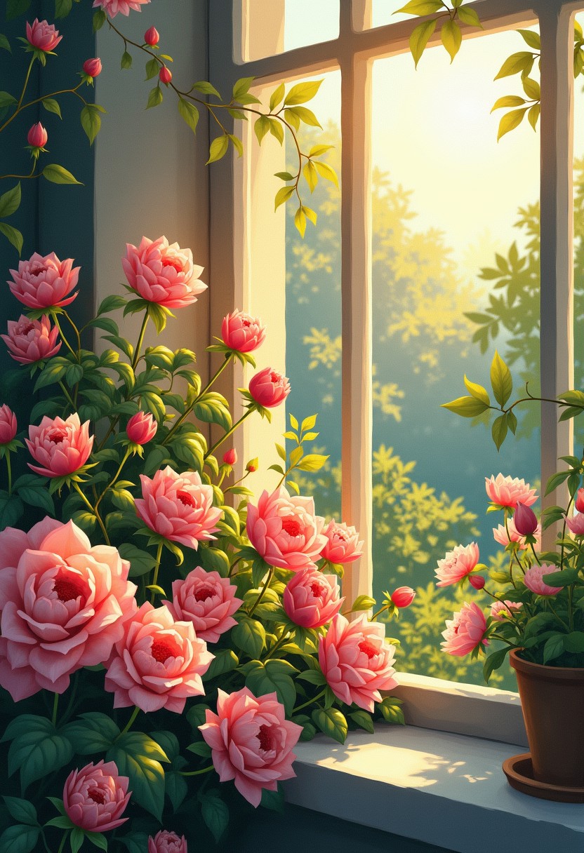 illustration of variegated flowers on the back terrace of a country mansion, basking in the warmth of late afternoon spring sunlight