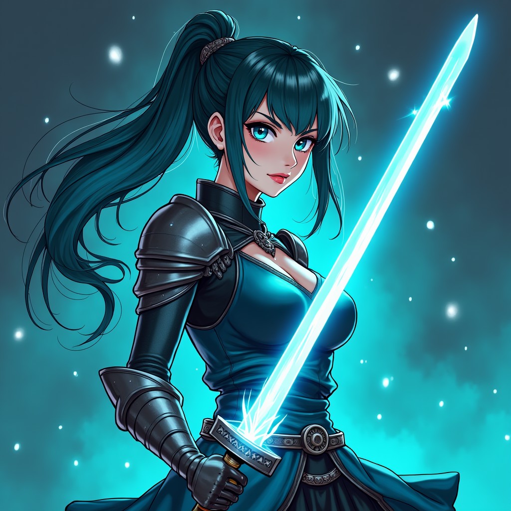 A knight holding her sword, Cyan teal black white, beautiful face, anime, martial arts sword pose, glowing sword