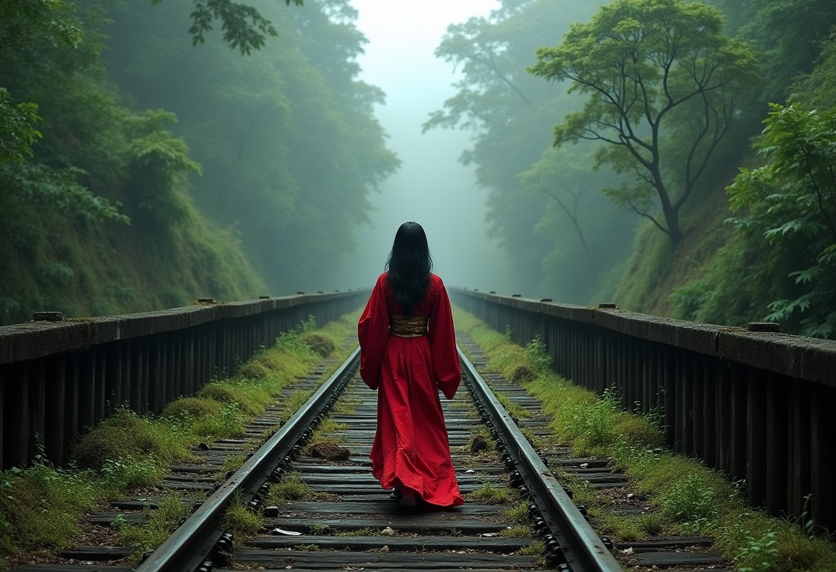 A hauntingly beautiful masterpiece by artist capturing an abandoned wooden rail bridge in Taiwan. The bridge is overrun with moss, rusty rails, and rotting wood, creating an eerie atmosphere. Surrounded by lush green trees and a misty, mysterious air, the bridge stands as a testament to time's relentless passage.A beautiful and magnificent samurai woman with her red kimono is coming towards us from afar. The wide long shot composition showcases the artist's incredible attention to detail and ability to evoke a sense of long-forgotten solitude.