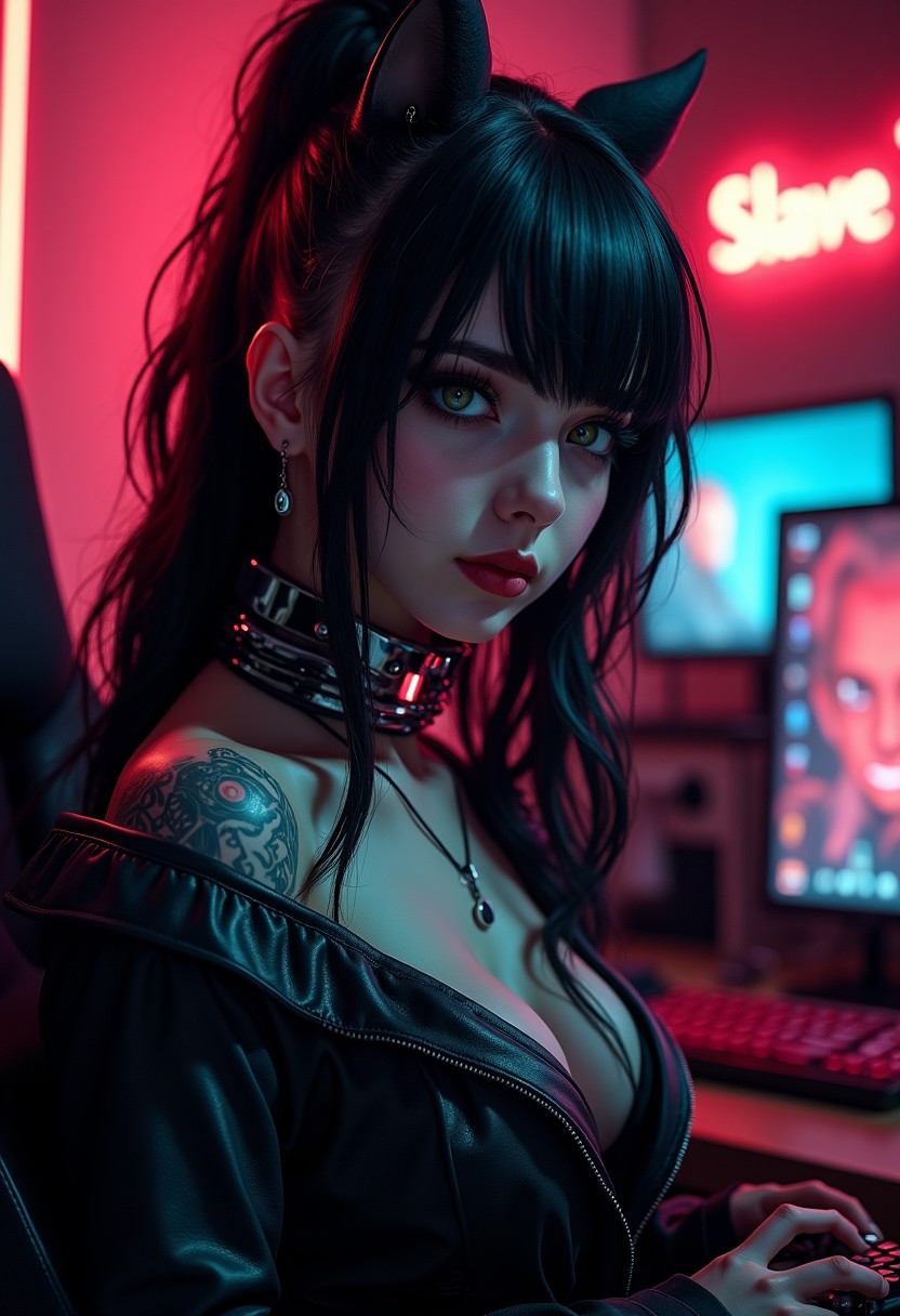 (ultra realistic,32k, ultra sharp,masterpiece:1.2),(high detailed skin:1.1),( high quality:1.1),(ultra high res:1.4), (beautiful lighting:1.4), (dynamic angle:1.6), infernal, gothic, spiritual, unusual, elegant, elusive, translucent, exquisite, athletic, reptilian, (realistic photo, realism, professional, intricate details, masterpiece, best quality:1.5), (futuristic 3cm high chromed slave shock collar tight around neck, with lights and display on collar, text on display "Slave":1.99), goth girl, tattoos, green eyes, very long black hair, wavy hair, high ponytail, black mascara, black eyeliner, dark red lipgloss, (cat eyes, split eyes, cat ears:1.5), (porcelain skin), dark gaming room, leather bolero, neon lights, gaming, shy smile, neon wall decorations, (piercings),