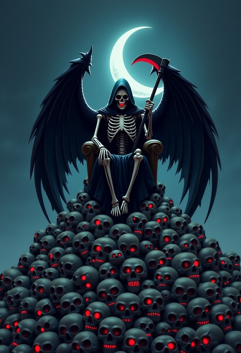 night time, crescent moon, large pile of skulls with a throne at the top, large hooded skeleton sitting at top of pile. red lights light it's eyes, the skeleton is holding a scythe, black angel wings, grin