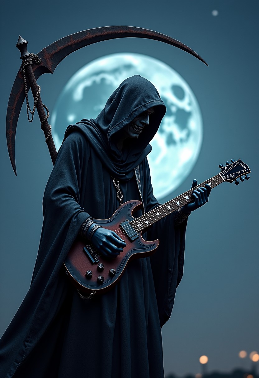 night time, crescent moon, grim reaper playing flying V guitar