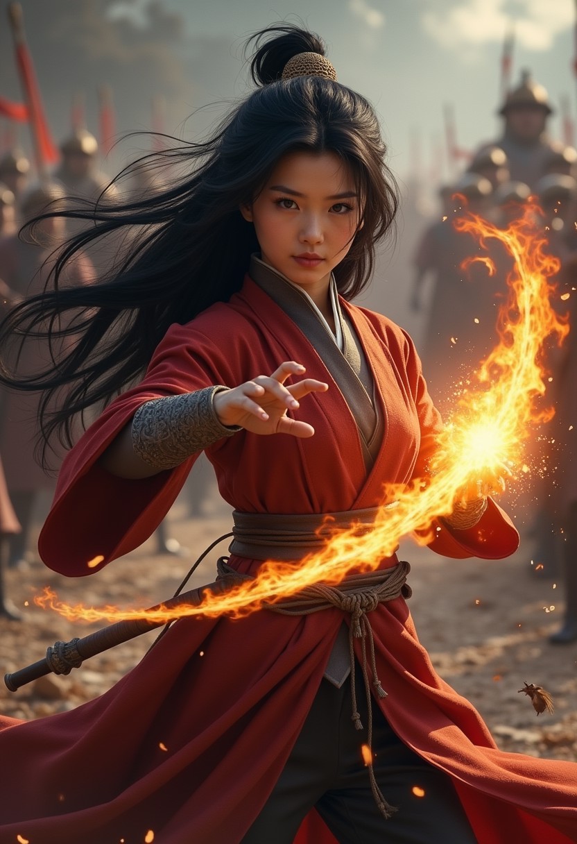 Photo of a female battlemage, dynamic pose, casting a fireball spell, young Japanese woman, long hair, black hair, black eyes, medieval battlefield background