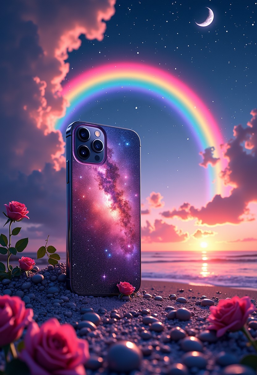 a starlit sky, a magical iPhone 16 captures the essence of a vibrant rainbow, colorful roses, and sparkling crystal pebbles. This celestial device, bathed in the light of stars, shooting stars, a silver crescent moon, and the Milky Way, creates a dreamlike ambiance. It weaves a rich tapestry of colors, transitioning from vivid reds to deep purples, and spanning hues of pink, yellow, blue, and green, panorama invites the heart to explore the depths of love and the wonders of imagination, capturing the essence of joy and the boundless creativity of the universe in a single, enchanting view.