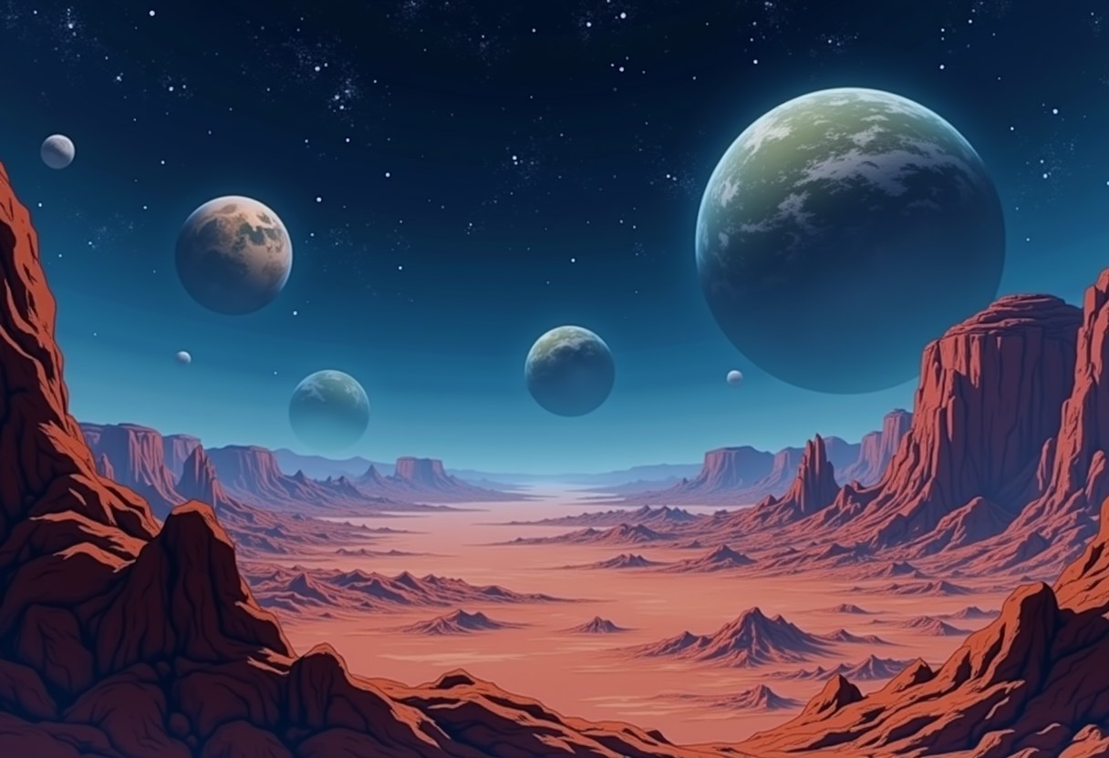 screenshot from 80’s anime cartoon. Science fiction, sci fi anime from the 90s, alien planet