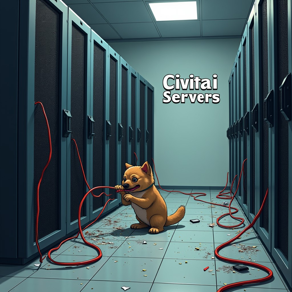 Depiction of a server room with the inscription "Civitai Servers" on the wall, with a little dog biting cables and causing destruction all over the room