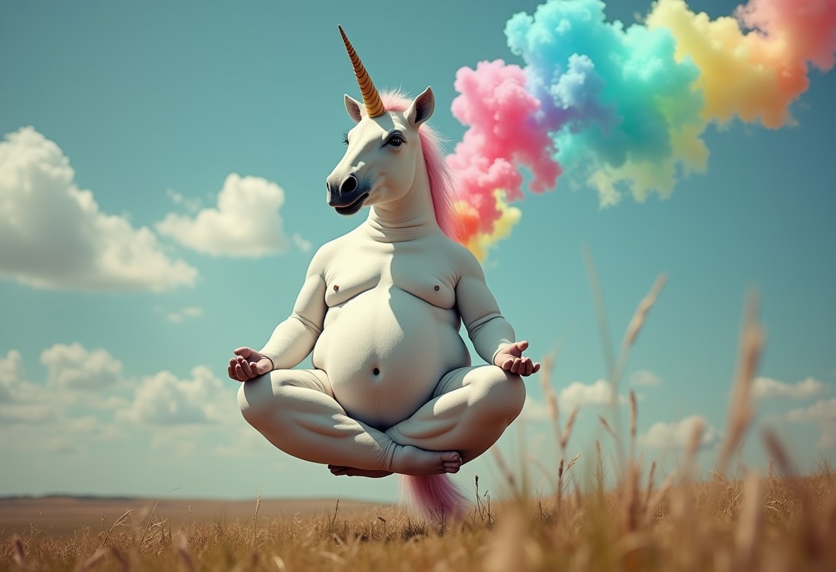 A overweight unicorn hovering above ground in yoga lotus position , a stream of rainbow colored smoke coming out of his butt