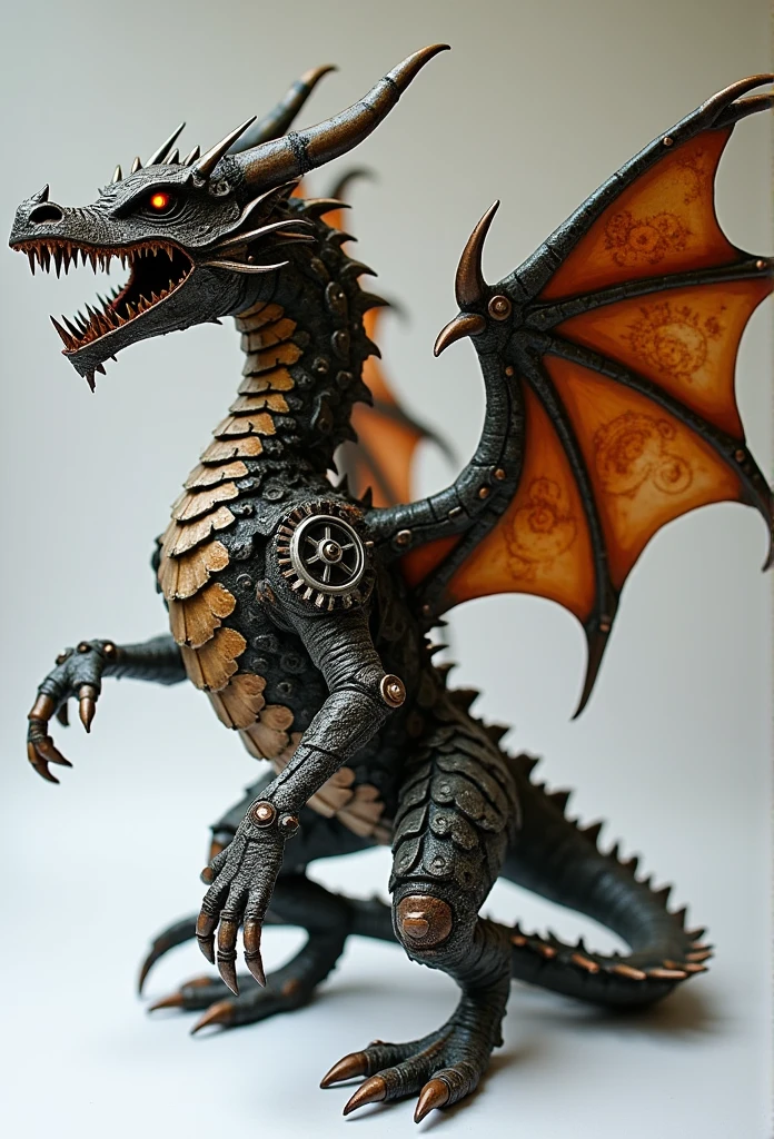 The image features a highly detailed sculpture of a dragon with mechanical elements. The dragon stands upright on its hind legs, with one claw lifted as if poised to strike. Its body is adorned with intricate gears, cogs, and mechanical parts that mimic the natural anatomy of a mythical dragon. The wings are spread wide, showcasing a webbed structure similar to bat wings but constructed from metal and mechanical components. The head of the dragon is elongated with sharp metallic teeth visible in its open mouth, and glowing red eyes add a lifelike quality to the sculpture. The tail coils behind the body, ending in what appears to be a sharp tip. The craftsmanship of this sculpture is remarkable for its blending of organic dragon imagery with steampunk-inspired machinery. Each scale and gear seems meticulously placed to create an imposing figure that merges fantasy with industrial design.