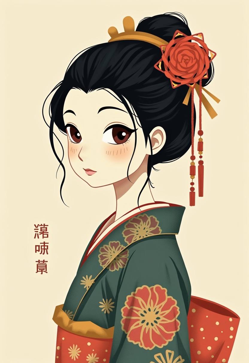 Digital illustration in the style of modern Japanese art with a muted color palette. A stylized female figure in traditional Japanese attire, facing left in a contemplative pose. The artwork is dominated by geometric shapes and patterns, with a minimalistic approach to facial features.