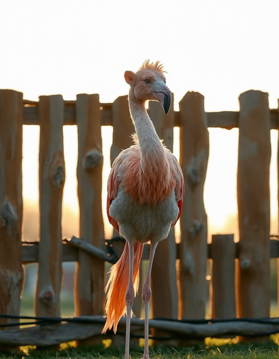 A serene photograph of a 'Flarion' (hybrid of Flamingo and Lion) standing on its hind legs in front of a rustic wooden fence, with a calm expression. The subject is positioned 3/4 from the left side of the frame, with its neck slightly bent and feathers rustling in the gentle breeze. The warm sunlight casts a golden glow on the scene, illuminating the texture of the fence and the Flarion's vibrant pink plumage. The background features a subtle gradient transitioning from soft blue to orange hues, evoking a sense of late afternoon.