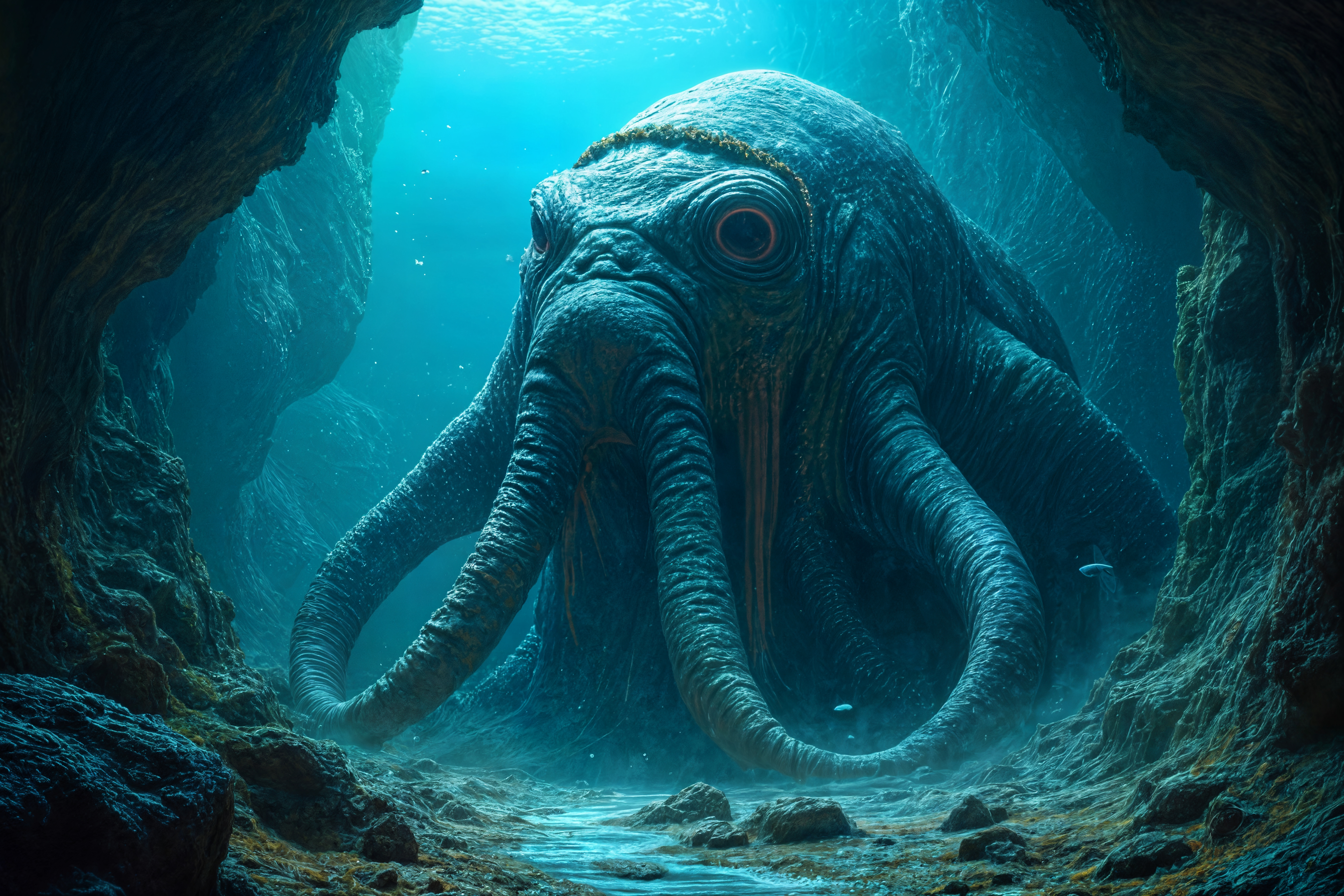 A cavernous abyss beneath the ocean floor. Bioluminescent creatures cast an eerie glow on jagged rock formations. Ghostly shipwrecks litter the seafloor, their treasures long lost. Bubbles rise from hidden fissures. A monstrous kraken lurks in the shadows. Its massive tentacles, covered in ancient scars, coil around forgotten ruins. Enormous eyes gleam with predatory intelligence. Rows of razor-sharp teeth line its beak. Its leathery skin shifts colors to match its surroundings. A crown of barnacles adorns its head. Haunting whale songs echo in the distance. Currents swirl ominously around its lair.