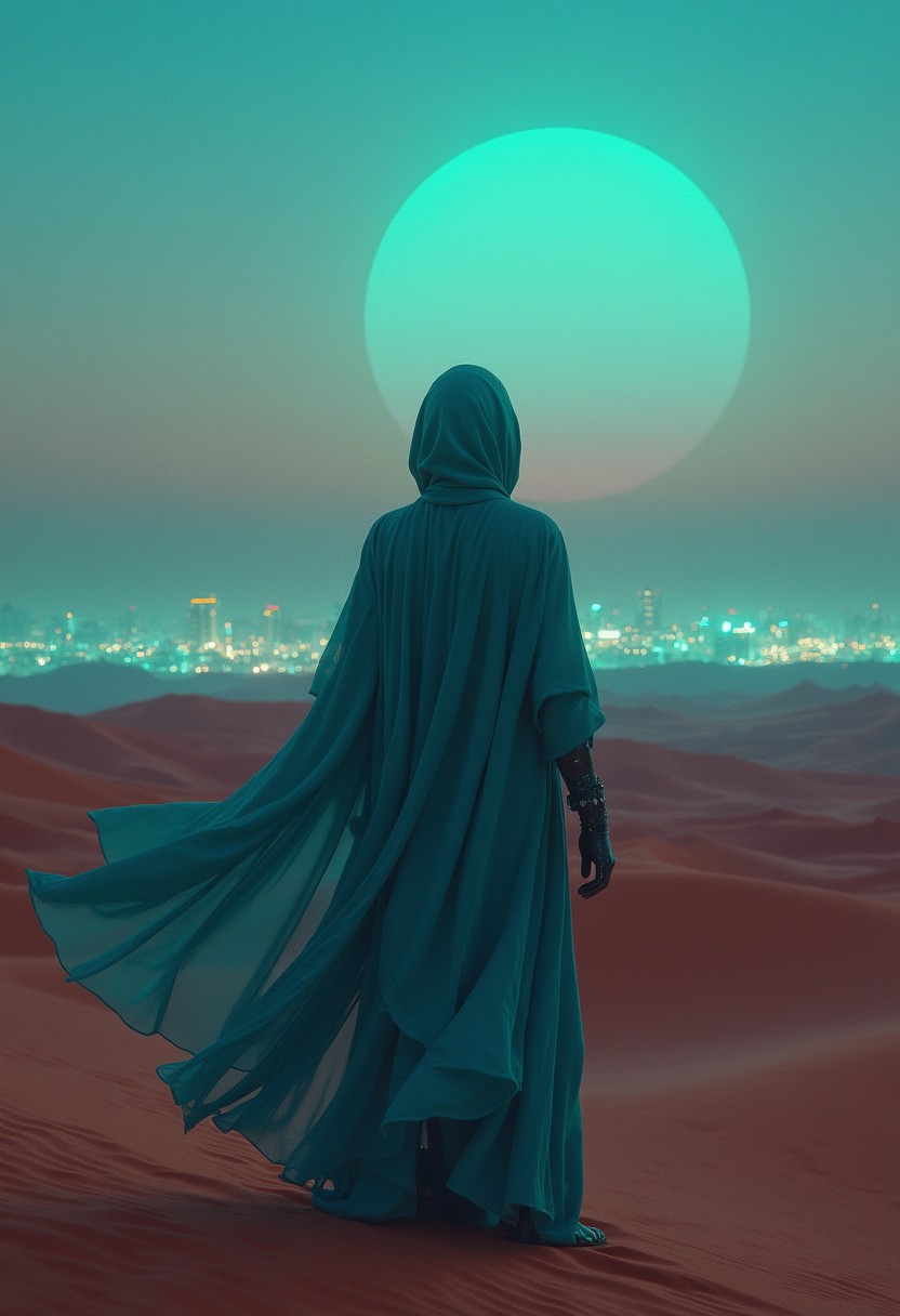 Digital Wanderer, Azure Dusk: Vaporwave aesthetic, flowing digital robes, lone figure amidst rust-colored dunes, distant city shimmering with emerald lights, melancholic synthwave soundtrack.