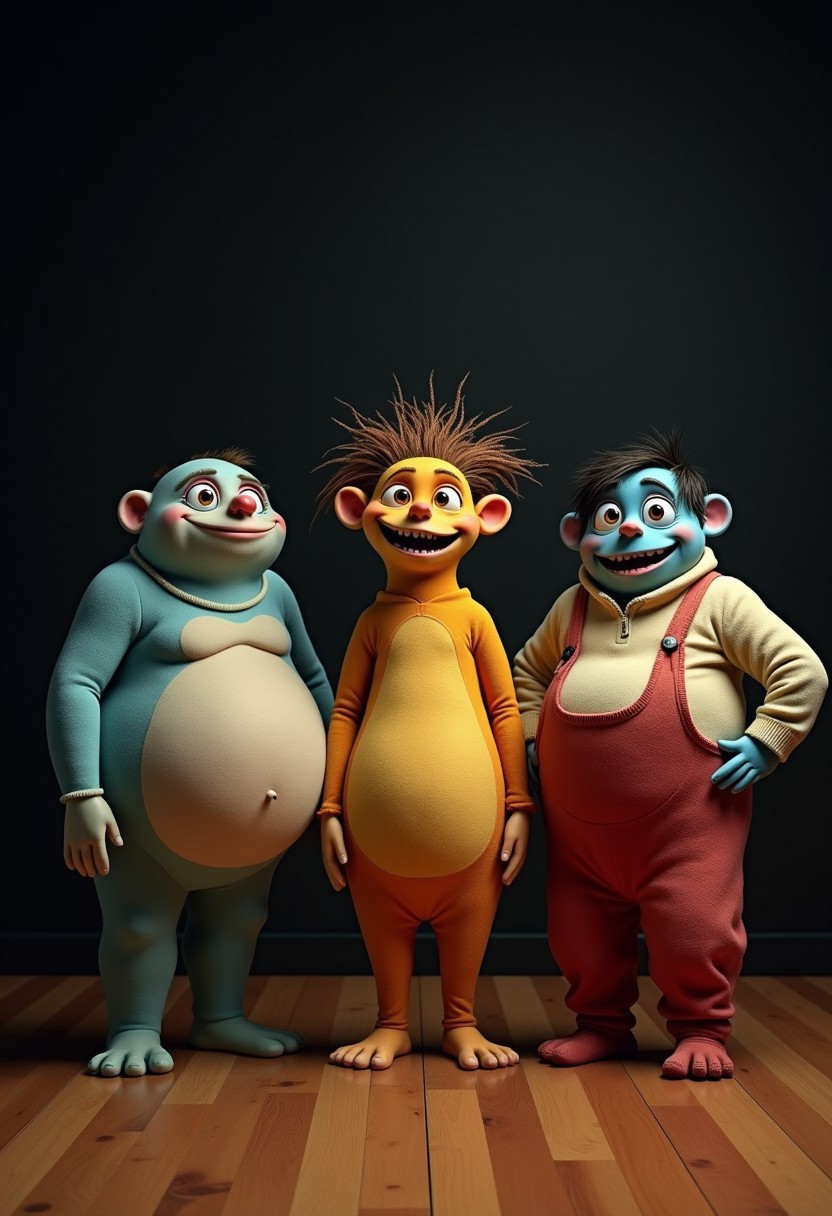 Trio of fanciful characters in a studio against a mysterious darkness, standing in a row; one rotund, one with a cascade of hair, one grinning widely; hardwood floor, inky void, lively colors.