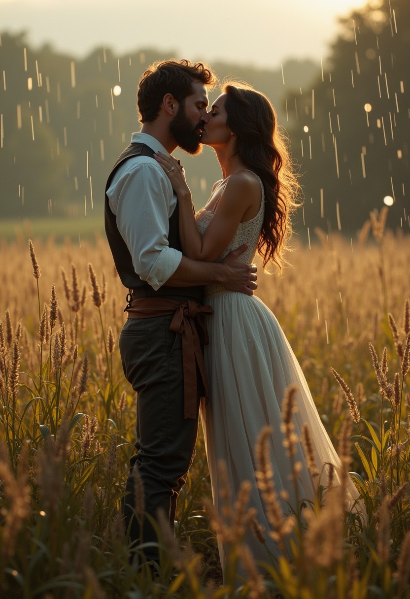 raining on a field of a farm in daylight, two people: one man and one woman, man dressed like a poor farmer but very handsome with a strong beard, the woman is stunningly beautiful and dressed rich and elegantly, man is holding woman up with her legs wrapped around his hips, the two are kissing in an extremely romantic, passionate way - their life has been waiting for this moment and now their love is affirmed