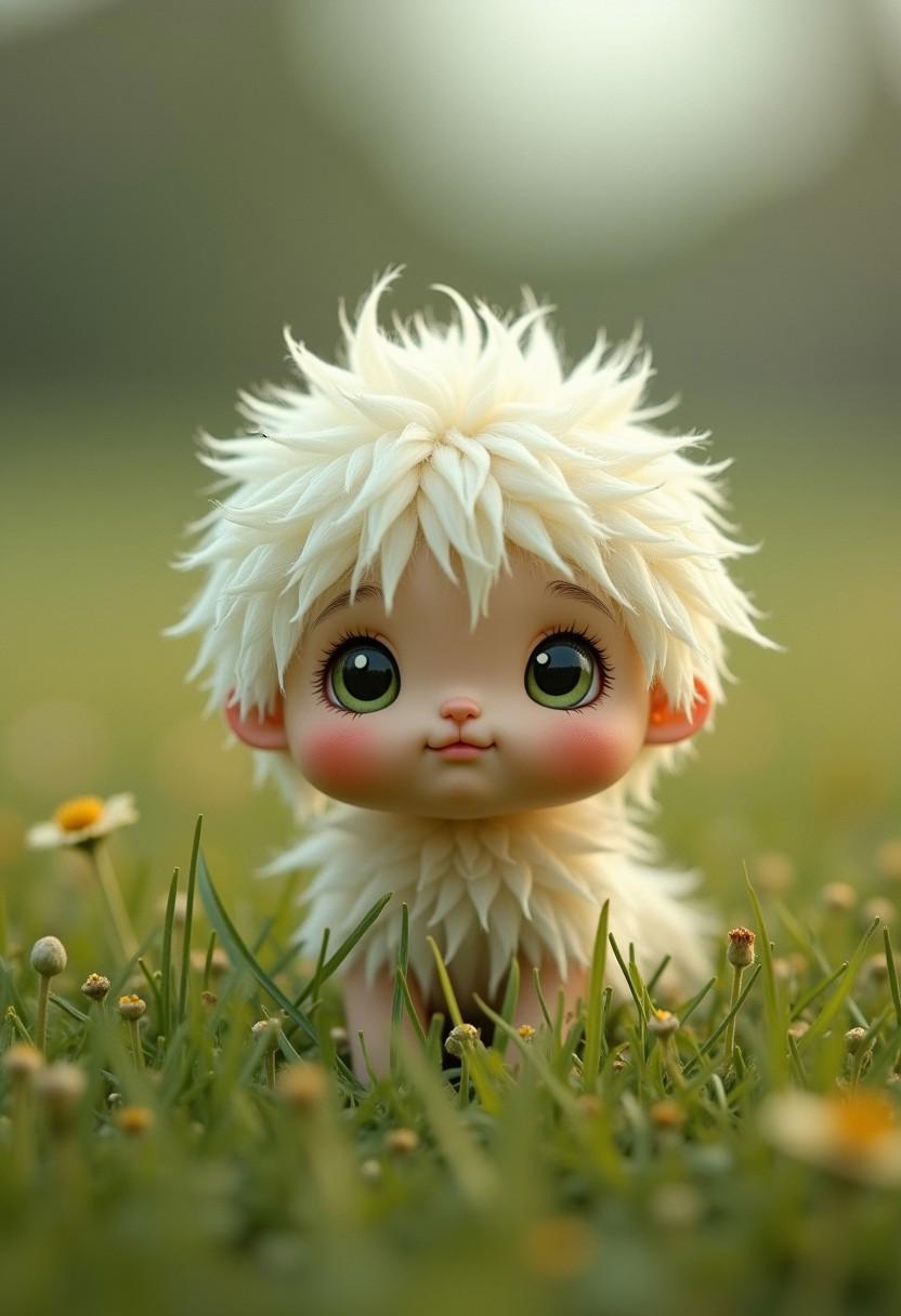 Cute fluffy Chibi, caricature style on the screen, clear lime eyes, hiding in the grass, the fragility of film films, 3 spoiled frames on old projector films from Anna Millen and George Cruickshank, Bordello II and Brian Froude, smooth frame, cropping cracked varnish. clear focus, artforum trend, behance HD, muted background colors