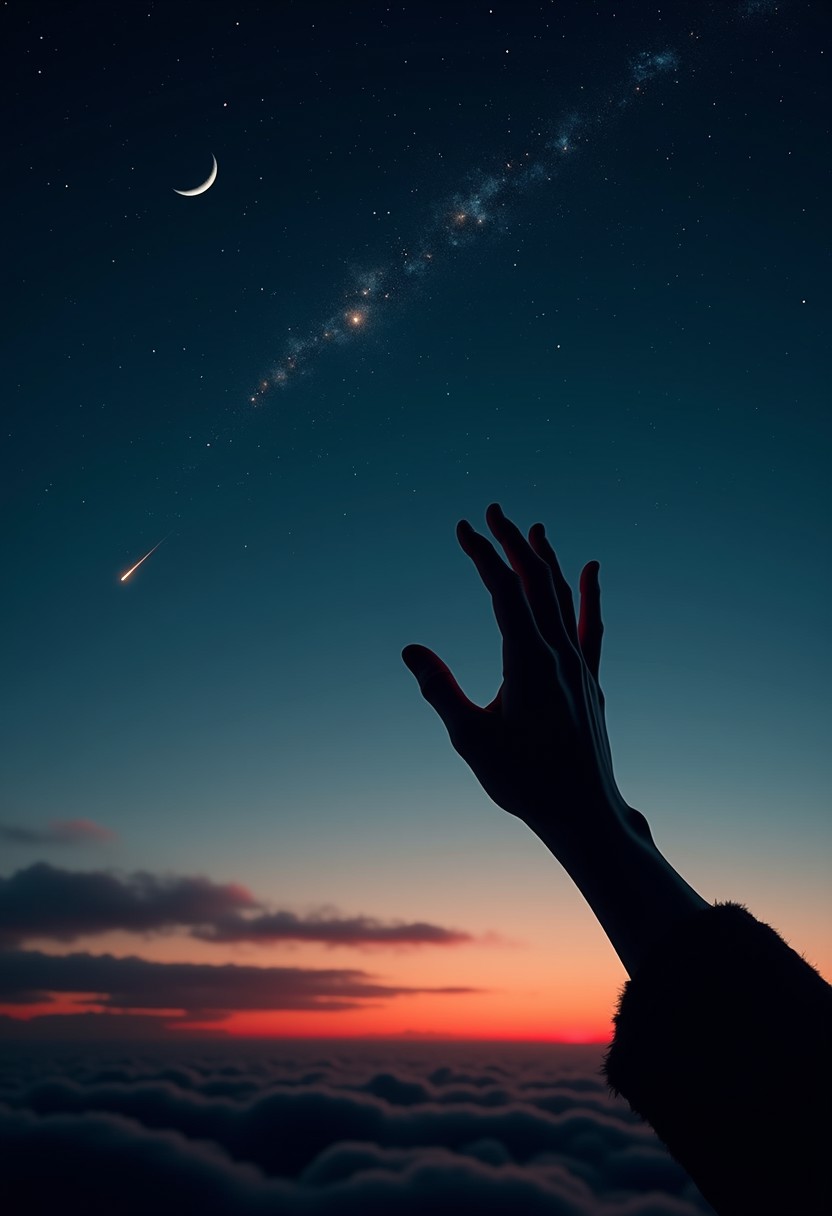 In this poetic scene, the velvet night sky is adorned with scattered stars and a crescent moon, inviting endless wonder. The horizon glows with the fading embers of sunset, painting the clouds with a subtle, serene red. In the foreground, a hand reaches towards the sky, as if striving to touch the distant stars and moon. The silhouette contrasts sharply with the light and dark, symbolizing humanity’s pursuit of dreams and longing for the universe. Fingers slightly spread, the hand seems to grasp at the fleeting meteor, wishing upon the boundless heavens. This image captures a moment of yearning and introspection, where the transition from dusk to night reflects life’s fleeting beauty and the eternal quest for the unknown.