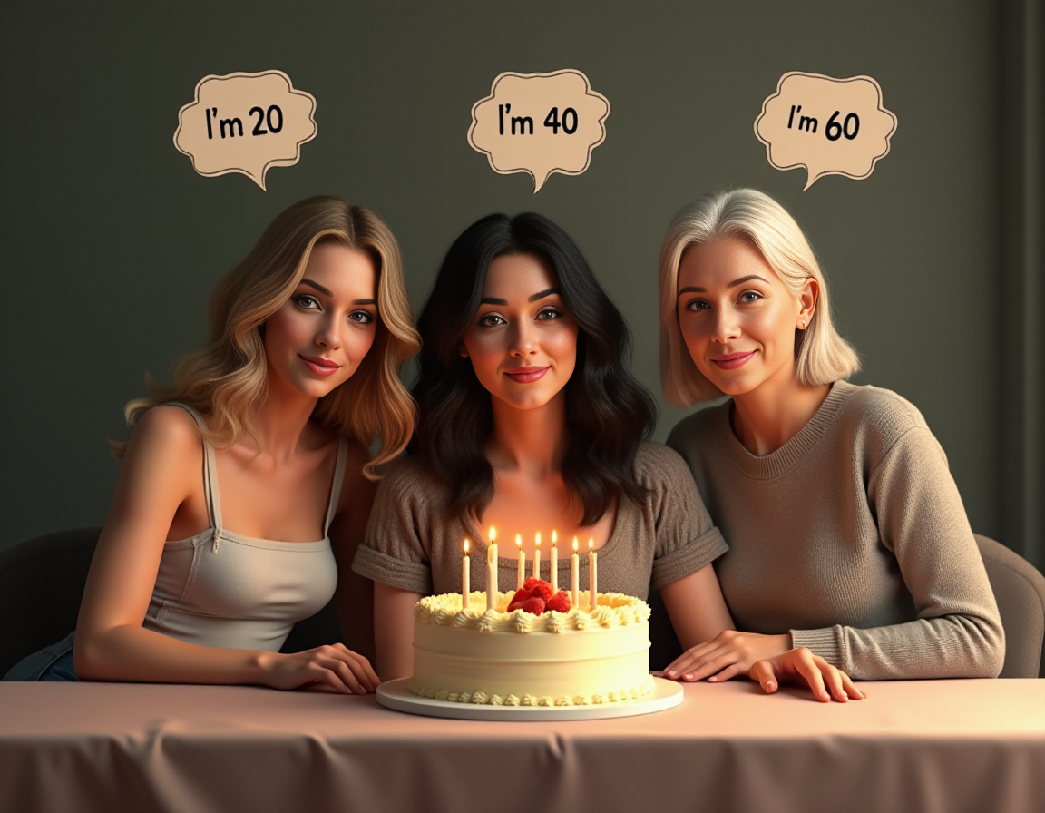 Three persons are sitting at the table, with birthday cake in front of them. Mary, Jane and Cathy. All are females. Mary is age 20, and she had long blonde hair. Mary is wearing jeans and crop top. Jane is middle aged woman, in her 40-ies. She is slightly chubby, with dark hair. Jane wears long summer dress and heels. Cathy is old woman, age 60. She is wearing sweater and pants. They are posing together for family photo. Photography is hyper realistic, ultra detailed, with intricate details, realistic skin textures, lights and shadows. Above Mary's head there is speech bubble with text "I'm 20". Above Jane head there is speech bubble with text "I'm 40". Above Cathy head is speech bubble with text "I'm 60".