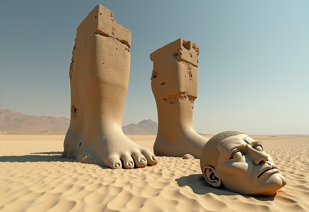 Two vast and trunkless legs of stone Stand in the desart.[d] Near them, on the sand, Half sunk, a shattered visage lies, whose frown, And wrinkled lip, and sneer of cold command, Tell that its sculptor well those passions read Which yet survive, stamped on these lifeless things, The hand that mocked them and the heart that fed: And on the pedestal these words appear: "My name is Ozymandias, King of Kings: Look on my works, ye Mighty, and despair!" No thing beside remains. Round the decay Of that colossal wreck, boundless and bare The lone and level sands stretch far away