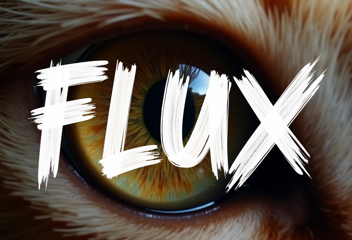 Extreme close-up of a single Cat eye, direct frontal view. Detailed iris and pupil. Sharp focus on eye texture and color. Natural lighting to capture authentic eye shine and depth. The word "FLUX" is painted over it in big, white brush strokes with visible texture.