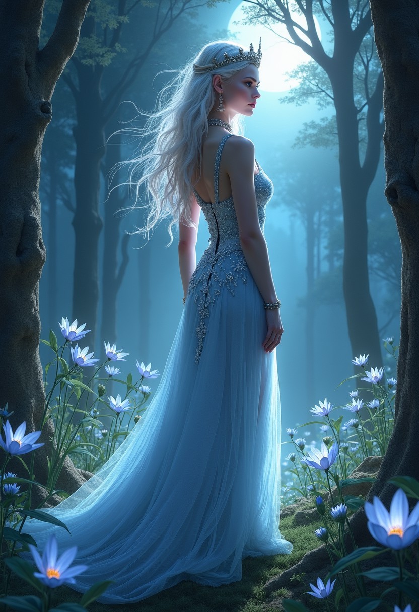A radiant fantasy elf queen standing in a moonlit forest, surrounded by glowing flowers and towering ancient trees. Her long, flowing gown shimmers with a soft iridescence, her eyes reflecting the moonlight. The scene is serene yet powerful, with a cool, silver-blue color palette, and a gentle breeze rustling through her hair. Majestic and ethereal, with delicate, reflective details and a magical glow.