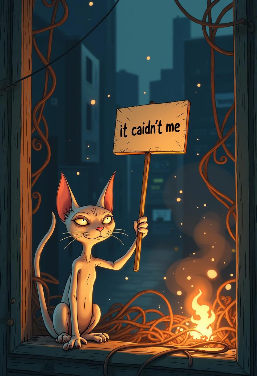 (masterpiece, best quality:1.5), ghibli style, whimsical and enchanting image in a cartoon style reminiscent of Studio Ghibli, ghibli and Tim Burton collaboration, source_cartoon, 8k, art, high-resolution illustration, a mean-looking skinny hairless cat holding a sign with text "it wasn't me", her skin is wrinkled and taut, sinister narrow-eyed expression, perched on a windowsill with soft dim light illuminating her, in the background there are computers on fire, server room with ripped cables, messy chaotic hardware, sparks and smoke, very detailed anime art, read description, Expressiveh, all drawn with a soft hand-painted look, style is characterized by clean lines, soft gradients, and a harmonious blend of colors, extremely detailed