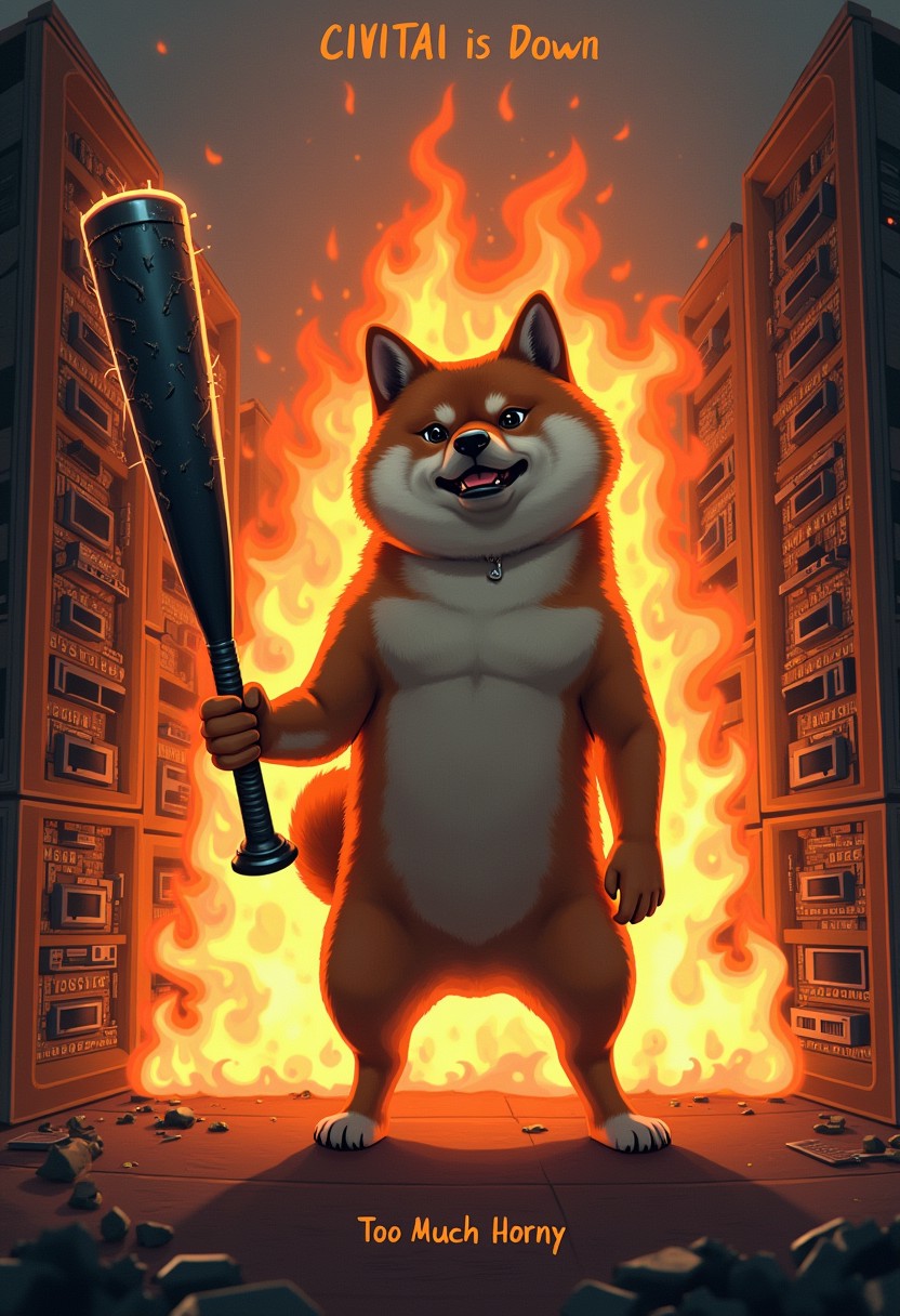 Doge, Shiba Inu holding a spiked baseball bat, standing in front of a burning computer center, the top says "CIVITAI is Down" the bottom says "Too Much Horny"