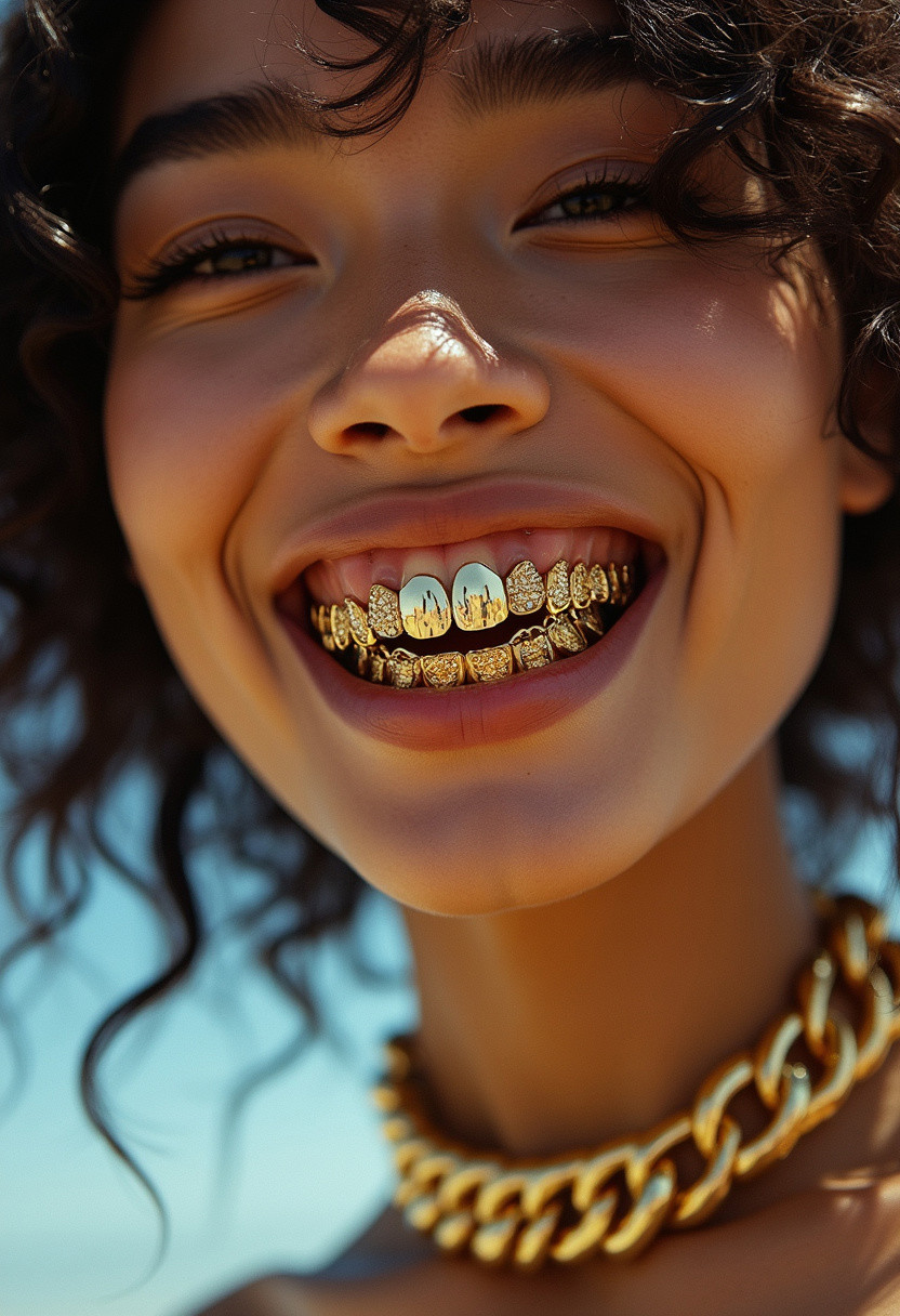 A close-up shot of a Japanese Balenciaga model smiling broadly, showing off golden grillz in a hip-hop style. The composition uses a fisheye lens, distorting and adding dynamic energy to the face and accessories. She wears oversized, bold gold chains around her neck that gleam in the light, and her dark, curly hair loosely frames her face. The image is full of energy, exuding a powerful and confident vibe, blending luxury and street style, perfectly capturing the iconic Balenciaga look.