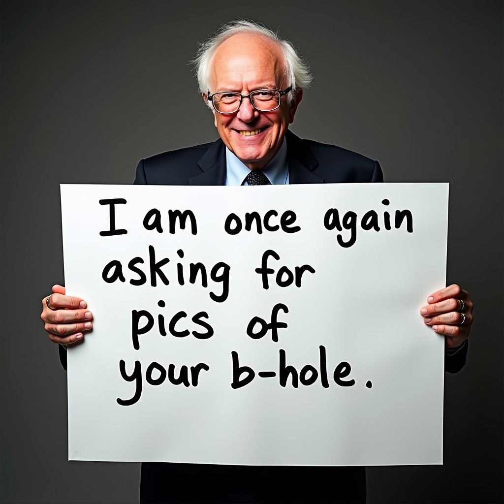 Photo of Bernie Sanders, holding a large poster with the words "I am once again asking for pics of your b-hole"