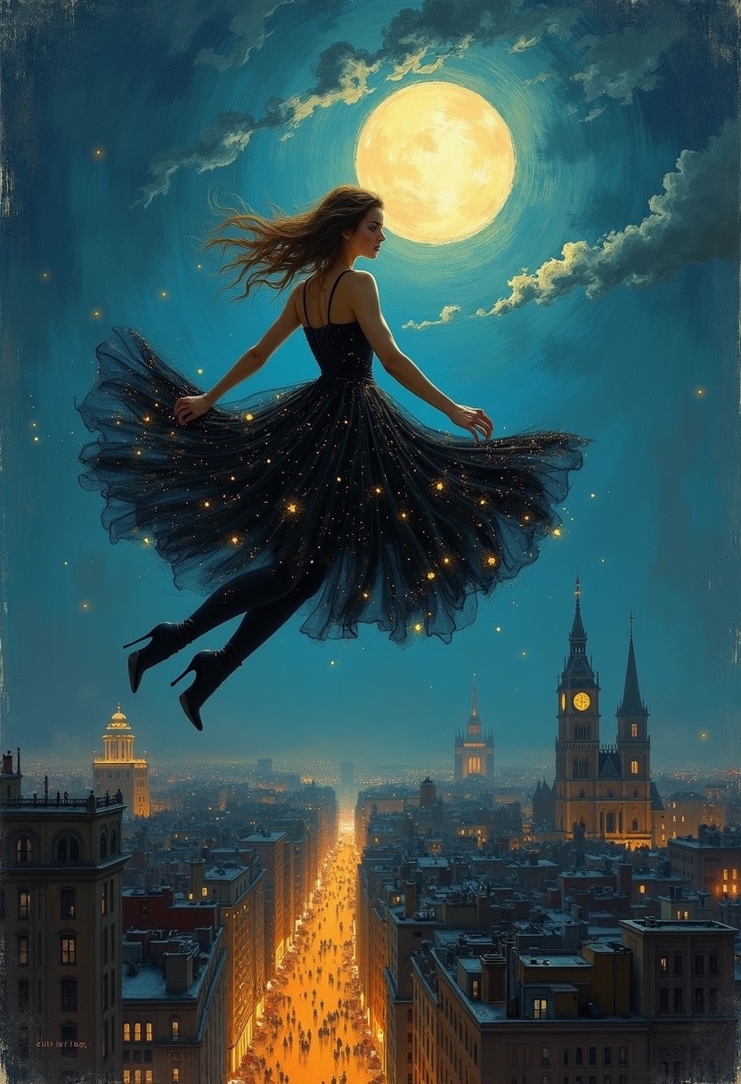 impressionist painting by Berthe Morisot, very rough painting with visible paint strokes, (dynamic_angle), a woman levitating over a city at night with a skirt blowing in the wind, 19th century buildings, high boots, clothes like midnight full of stars, Night light, sharp shadows, moon lit, looking out over city, City landscape, dystopian city, crowds of people, standing high above stret, illustration,