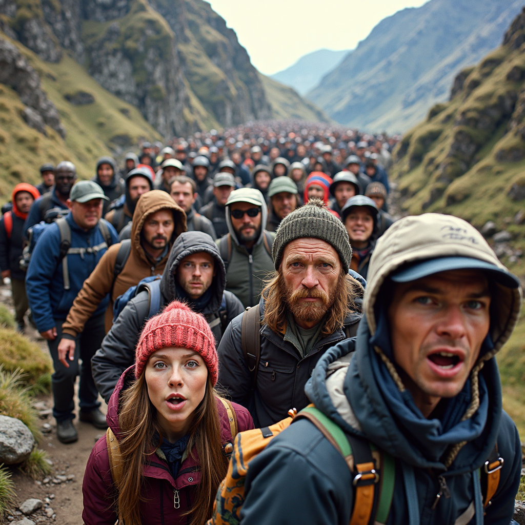 a large group of diverse groups of tourists climbing and walking around machu-pikchu, looking at camera with surprised face emotions, messy and cluttered composition, detailed and complex