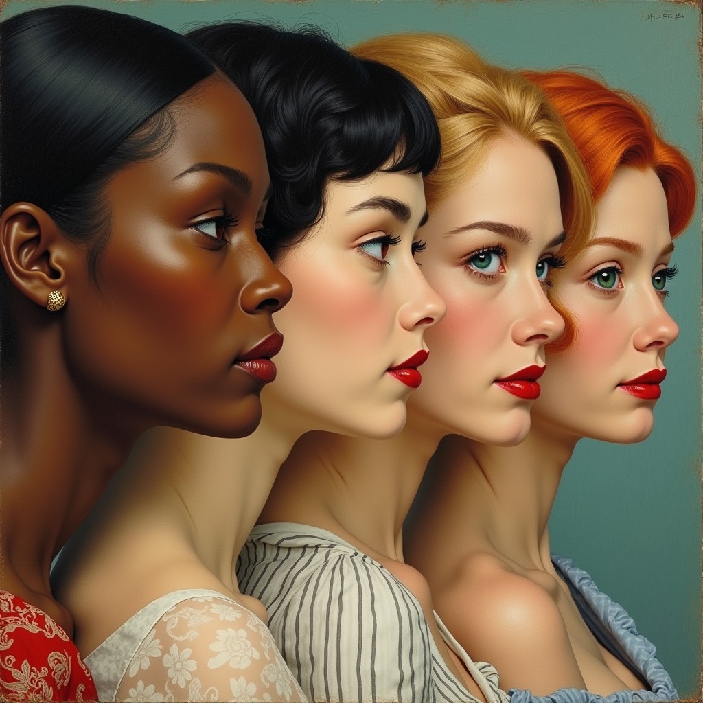 painting of 4 people, black African woman with a asian woman from japan on the left, blonde woman with blue eyes with a red haired woman with green eyes on the right, painting by William Adolphe Bouguereau and Norman Rockwell