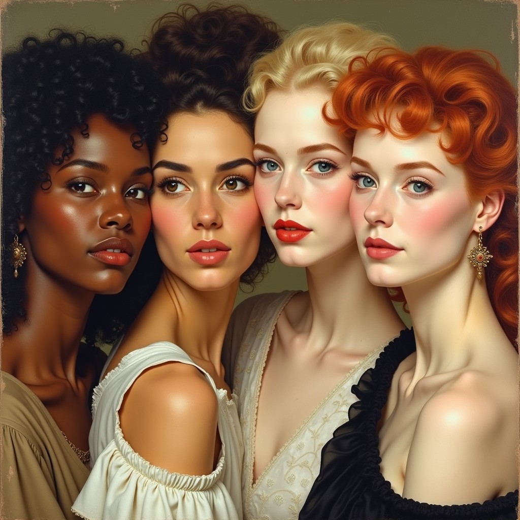 painting of 4 people, black African woman with a asian woman from japan on the left, blonde woman with blue eyes with a red haired woman with green eyes on the right, painting by William Adolphe Bouguereau and Norman Rockwell