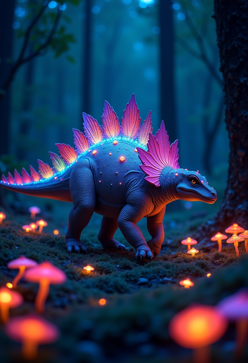 A luminous stegosaurus wanders through a fantastical, glowing forest. Its plates radiate a spectrum of iridescent colors, creating a dazzling display of light. The forest floor is covered in bioluminescent mushrooms and flowers, casting an ethereal glow. The scene is surreal and enchanting, medium shot, soft, bioluminescent light.