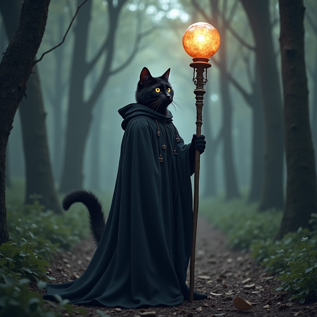 A black cat in an evil wizard robe holding a large Orb staff, summoning ritual, standing in an ancient forest, dark scene