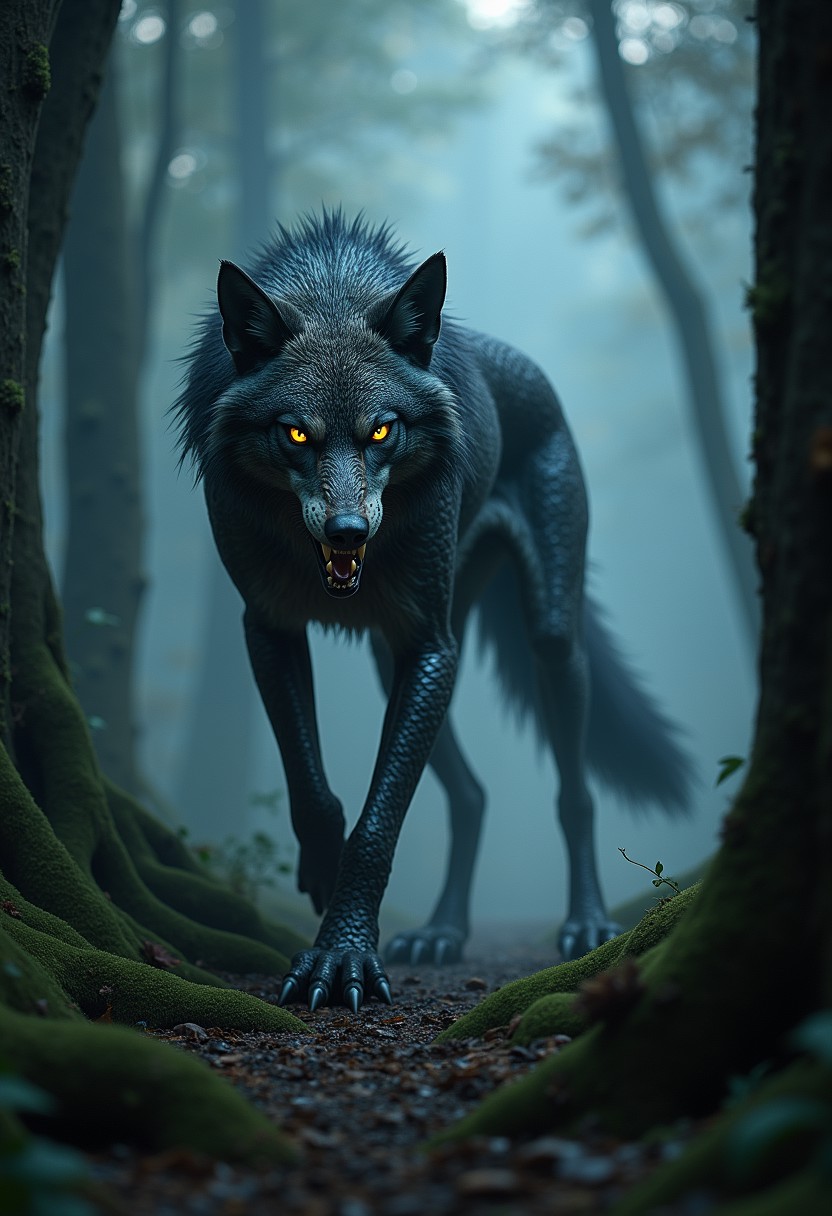 A menacing wolf-serpent hybrid slithering through a dense, misty forest at twilight. This creature has the sleek, muscular body of a wolf, covered in iridescent scales that shimmer in the low light, with the long, sinuous tail of a serpent. Its head is a fearsome blend of wolf and serpent, with sharp fangs and piercing, glowing eyes that cut through the darkness. The creature's fur is interspersed with scales, giving it an otherworldly, armored appearance. The mist clings to the forest floor, swirling around the hybrid as it moves stealthily between ancient trees, creating a mysterious, foreboding atmosphere. The image is dark and intense, with a haunting beauty that evokes the eerie, supernatural style of artist H.R. Giger.