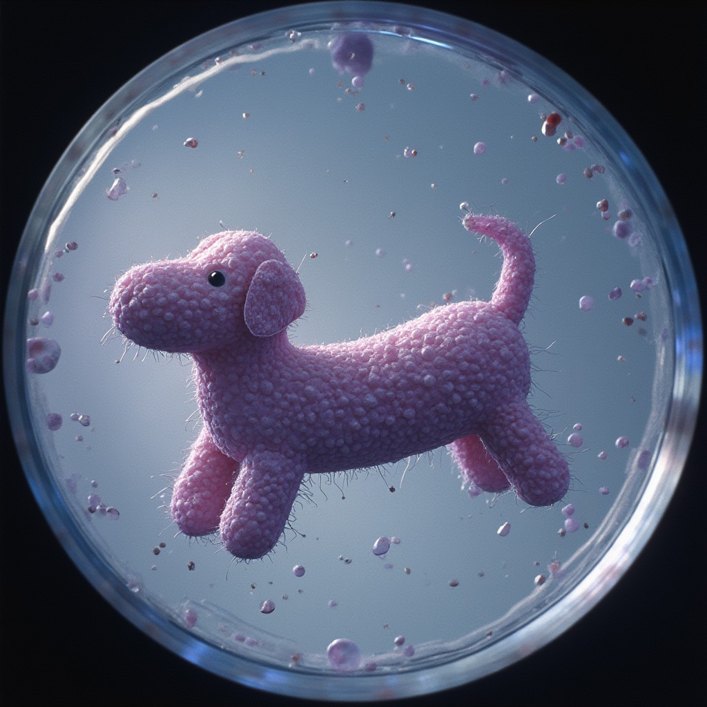 viewed through a microscope, a bacterium in a Petri dish, (shaped like a sausage dog)