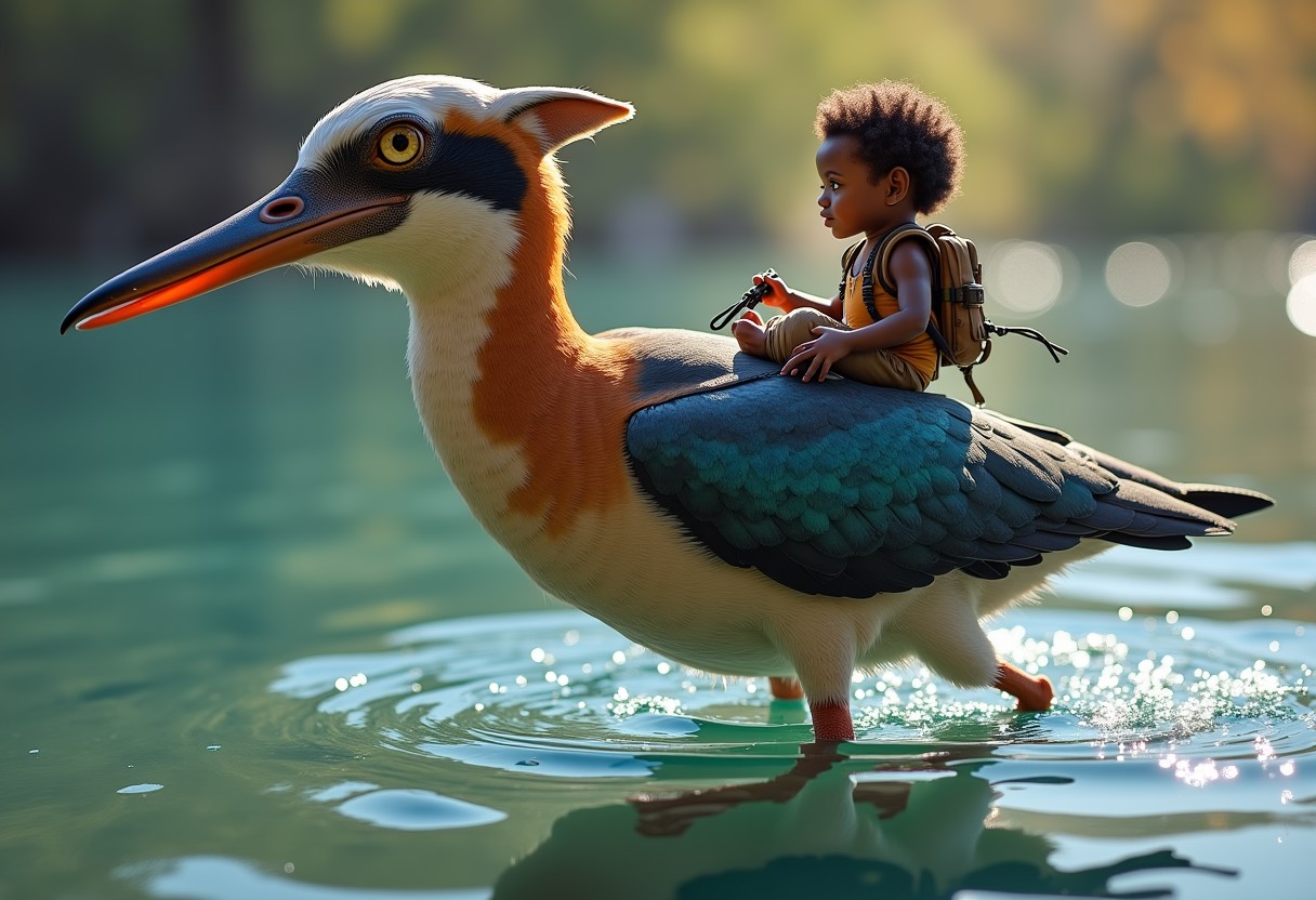 a small african elf pilot riding on the back of an osprey, reins, the bird's feathers have an iridescent shine, background lake, bokeh, in the style of a fantasy painting