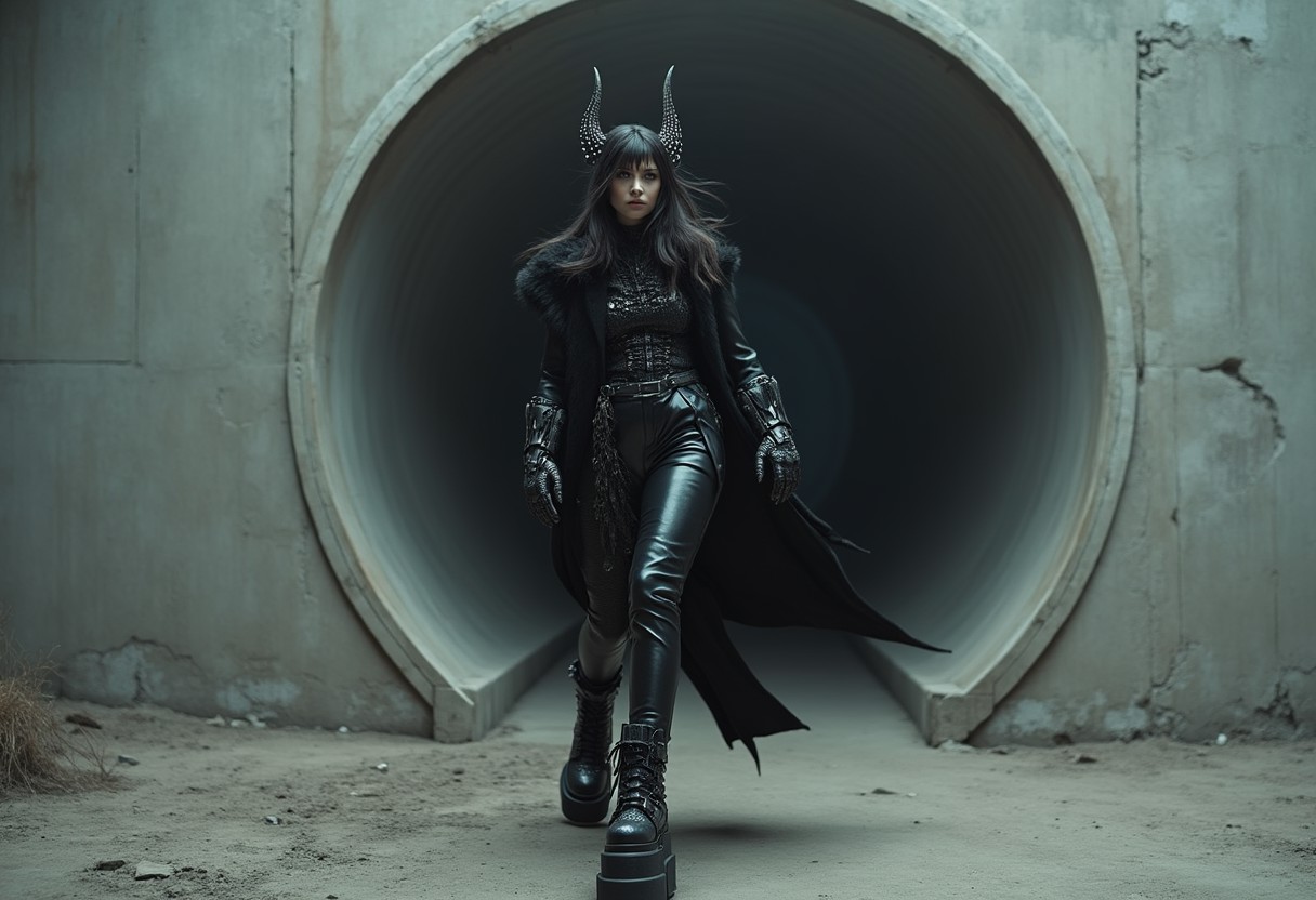 A powerful figure strikes a dynamic, commanding pose at the minimalistic entrance to a surreal version of hell. She is mid-stride, as if she’s just stepped out from the shadowy void beyond the archway. Her outfit is a fierce combination of gothic fashion and avant-garde design—spiked leather, dark furs, and intricate, ritualistic details. Her hands, clad in matching black, sculptural gloves, extend forward with purpose, mirroring the form and style of her shoes. The model’s pose is strong and dynamic, with one leg stepping forward, emphasizing the power in her stride. The futuristic shoes are more realistic yet retain a bold design, featuring thick, platform soles and angular shapes that complement her commanding presence. The hand gloves match the shoes in both design and material, creating a cohesive, powerful look. Her wild hair flows behind her, her horned headdress adds to her imposing silhouette. The white, otherworldly eyes and fierce expression make her seem like a dark, unstoppable force emerging from the abyss. Mood: Intense, powerful, and surreal— dynamic movement, capturing the moment of emergence from the underworld. The entrance to this surreal hell is a sleek, minimalist archway made of obsidian-like material, reflecting the dark, fiery sky above. The ground beneath her is smooth, almost liquid, mirroring the swirling shadows and faint flames that dance around the arch. making her appear as though she’s stepping into a new, foreboding realm.