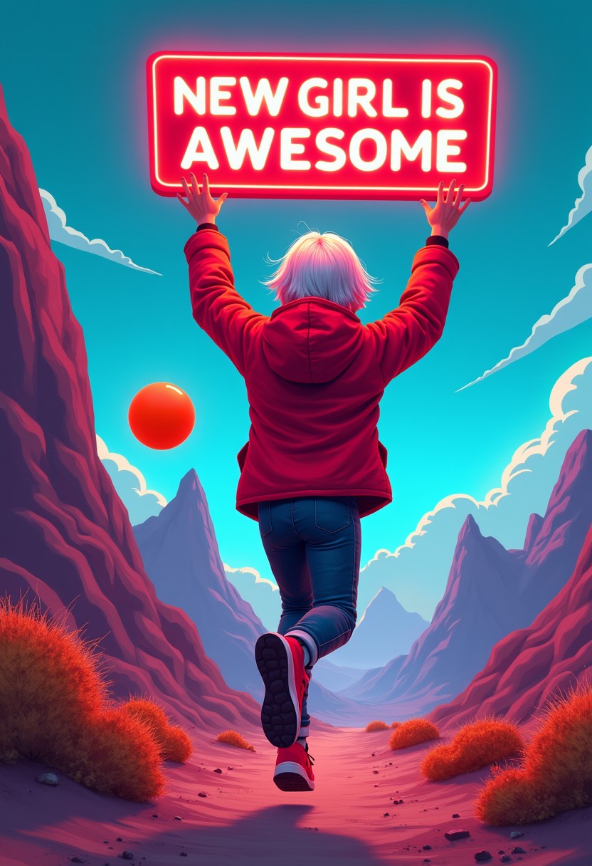 a short white hair girl in red runs down a mountain with an orange ball, in the style of beeple, light magenta and azure and black, accurate topography, desertwave, light cyan and red, generative art, mars ravelo, she hold a neon sign up above her head with both hand, the sign has text "NEW GIRL IS AWESOME"