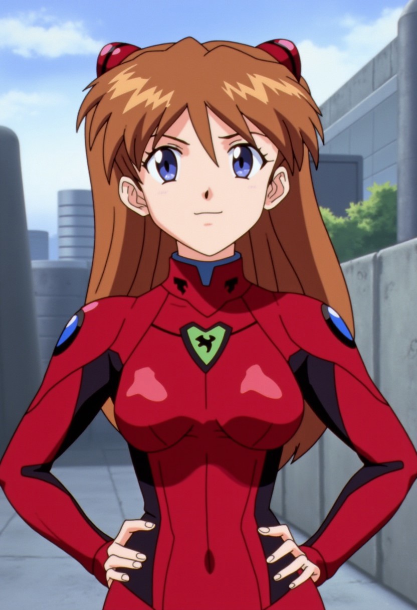 asuka langley soryu, long hair, bangs, blue eyes, brown hair, hair ornament, bodysuit, pilot suit, plugsuit, red bodysuit, interface headset, outdoors, cityscape, hands on hips, smile, cowboy shot, looking at viewer, solo, dutch angle,