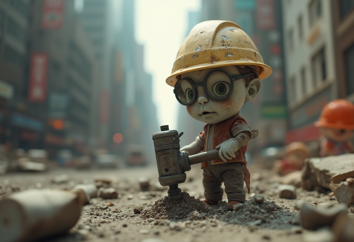 porcelain doll with a cracked face and chipped paint, hammering with a massive pneumatic hammer on a busy construction site. The doll is wearing a miniature hard hat and safety goggles. The background is a bustling city street filled with skyscrapers. Hyperrealistic, detailed, cinematic lighting, 8K, art by Greg Rutkowski, trending on ArtStation.