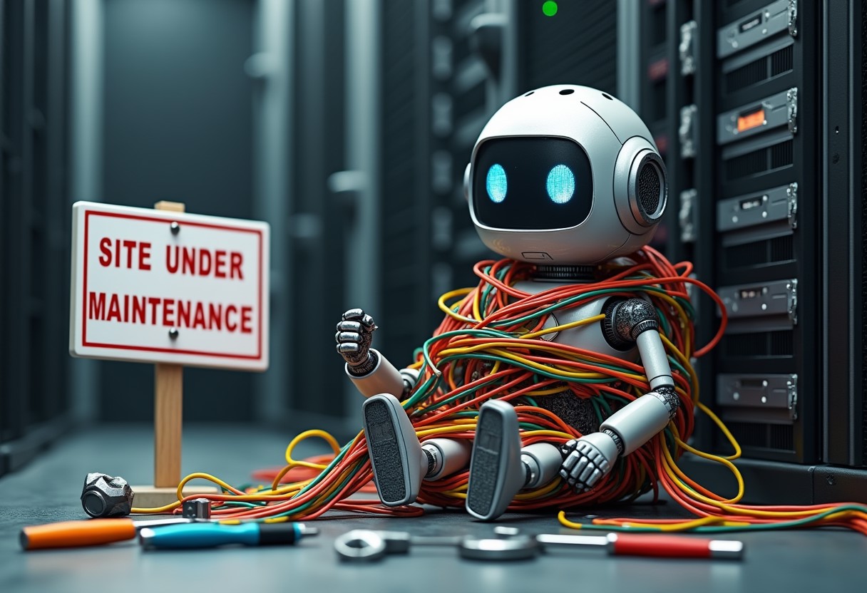 A quirky image of a robot tangled in a mess of colorful wires. The robot is in a sitting position, trying to untangle itself with an exasperated expression on its digital face. Nearby, a "Site Under Maintenance" sign is propped up against a server rack, and various tools like wrenches and screwdrivers are scattered around.