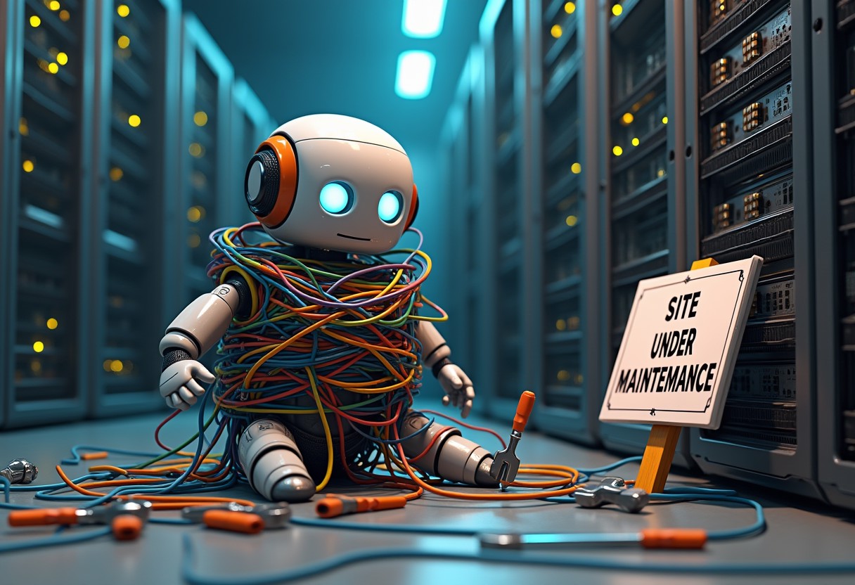 A quirky image of a robot tangled in a mess of colorful wires. The robot is in a sitting position, trying to untangle itself with an exasperated expression on its digital face. Nearby, a "Site Under Maintenance" sign is propped up against a server rack, and various tools like wrenches and screwdrivers are scattered around.
