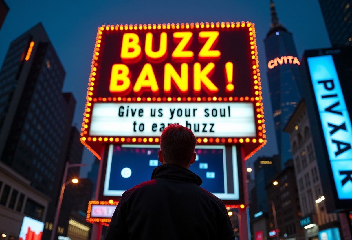 A picture of a man standing in front of a big and illuminated advertising sign, sign is located in a metropolitan city, the sign has two sections, top section says in a big bold orange "BUZZ BANK !", bottom section says in small black font " give us your soul to earn buzz", the sign background is made by small stylized lightings, in the background a skycraper with the CIVITAI logo