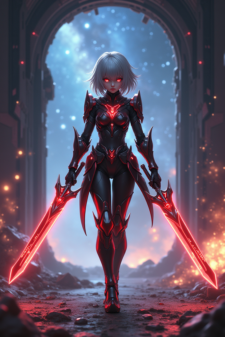 Hyper-realistic scene with amazing quality, a masterpiece in best quality, featuring hyper-detailed and ultra-detailed UHD rendering. The scene includes DOF (depth of field) and HDR for an immersive visual experience. A full-body view of a beautiful, cute girl with perfect anatomy and silver hair, standing in a fighting stance. Her detailed eyes and serious expression face the viewer as she navigates through a space ship in the vast universe. She moves towards a broken door with sparks and flames, set against the backdrop of the Milky Way and a starry sky. The girl is wearing a fantastic black and red hybrid armor, holding a glowing sword. The armor and sword shine with a dazzling, mecha-inspired glow. The setting has a strong technology and futuristic style, featuring a red titanium mecha in the background, with explosions and added sharpness to enhance the intensity.