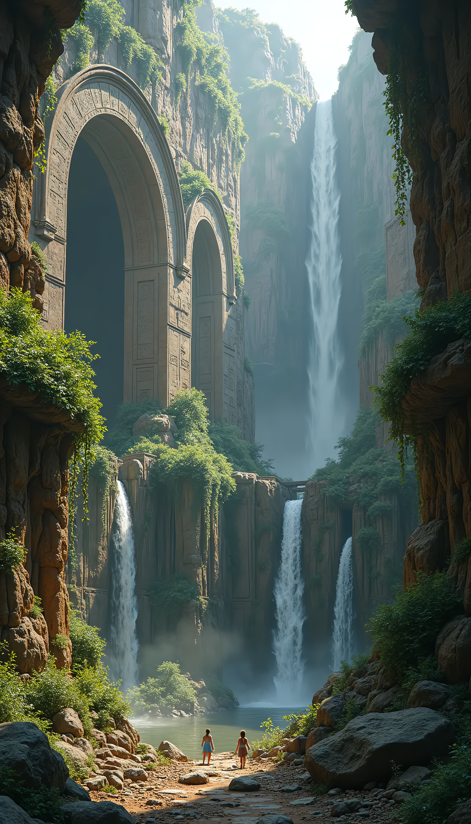 Ruins of an ancient civilization, built into the cliffs of a massive canyon. The ruins are filled with ancient writings and glowing glyphs, with vines and waterfalls weaving through the stone.